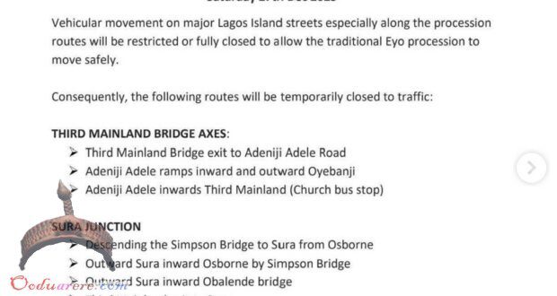 Residents, motorists, and commuters are advised to comply with traffic directives and plan their movements ahead of time to avoid delays. Road closures and heavy traffic are expected around key routes leading to Lagos Island. The public is encouraged to ...