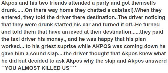 Akpos was given fake money and he went to the police station to report… AKPOS: What kind of nonsense is this? POLICE: Hello Mr. man can we help you? AKPOS: Can you imagine, in this country, people are just mean! POLICE: Mr. man, you aren’t saying anything. What is the problem. AKPOS: (still boiling). Why are people so unreasonable and wicked in this country? I wish I wasn’t born in this country. POLICE: (impatient) listen Mr. man, are you ready ...