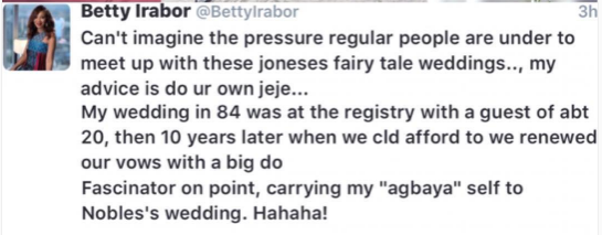 Owner of Genevieve magazine, Betty Irabor, speaks about fairytale weddings. She said,”I can’t imagine the pressure regular people are under to meet upwith these joneses fairy tale weddings.., my advice is do your own jeje. My wedding in 84 was at the registry with a guest of about 20,then 10 years later when we could addord to we renewed our vows with a big do fascinator on point, carying my “agbaya” self to noble’s wedding. hahaha”.