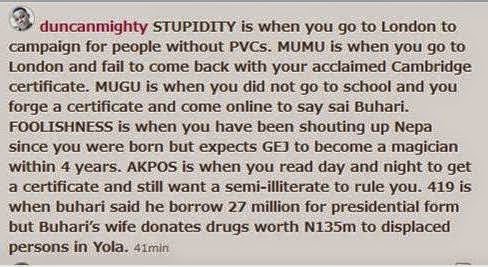 The self acclaimed Port Harcourt first son whose wife just graduated from the bible school took to his IG page yesterday to blast APC’s presidential candidate and his supporters but finished up being bombarded with a barrage of angry comments from fans after he posted a derogatory inscription in regards to the APC and its presidential flag bearer.