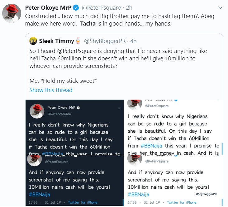 Peter psquare has denied Tacha oooo????#BBNaija19 pic.twitter.com/ji2XU1VXJ5