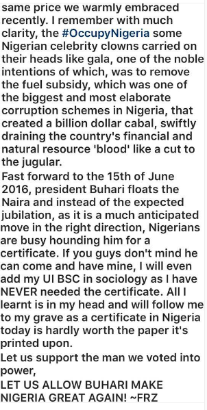 Fast forward to the 15th of June 2016, president Buhari floats the Naira and instead of the expected jubilation, as it is a much anticipated move in the right direction, Nigerians are busy hounding him for a certificate. If you guys don’t mind he can come and have mine, I will even add my UI BSC in sociology as I have NEVER needed the certificate. All I learnt is in my head and will follow me to my grave as a certificate in Nigeria today is hardly worth the paper it’s printed upon.