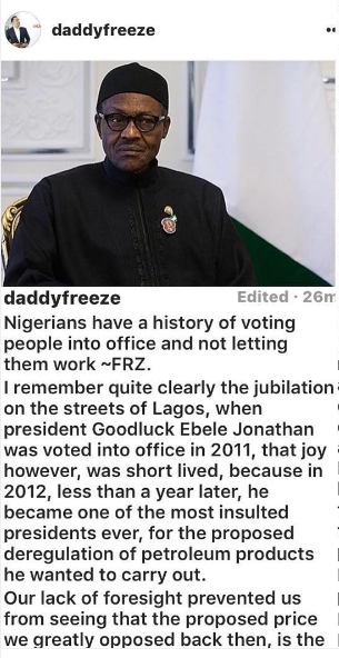 dayoalashebanksWhat they don’t know is that PMB might not even be the messia “the man that gets us to d promise land”, but he sure is an institute that masterminds this country’s overhaul. He is here to repair everyone’s mistake made in the past because indeed we all ve had our role in the injury we see our selves today. Take it or leave it, Nigeria can never be as it should be if each one of us don’t change our mentality bout governance. Like freeze said, it ain’t bout what u earned from college or where ever, it’s what we ve to offer to the table for nation building. We keep talking so quick to point fingers and all but no one is ready to face the wrath…. Nigeria is a long term project not a one year or even a fours overnight turnover!!! I support PMB admin be it slow or fast…. God help him and his machineries including the bad eggs amongst. #proudly??