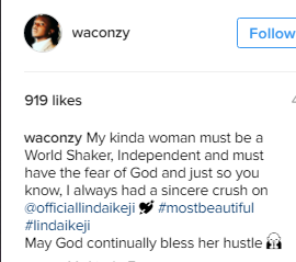 Long-time upcoming artiste, Waconzy, drenches his crush, Linda Ikeji, with praise.