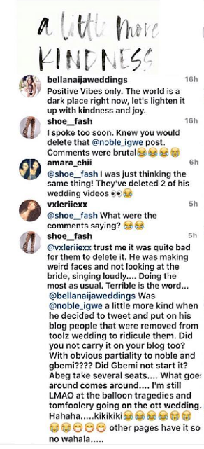 Noble Igwe engages commenters after Bellanaija was forced to delete 2 of his wedding videos due to negative comments.
