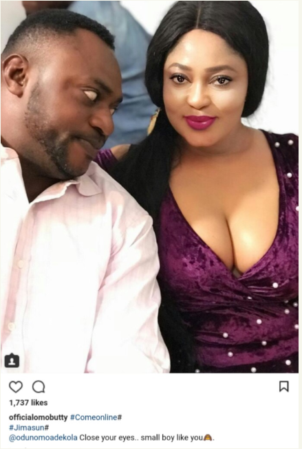 Curvy actress Omobusty caught Odunlade Adekola looking at her open cleveage and she told him; ”Odunlade close your eyes, small boy like you..