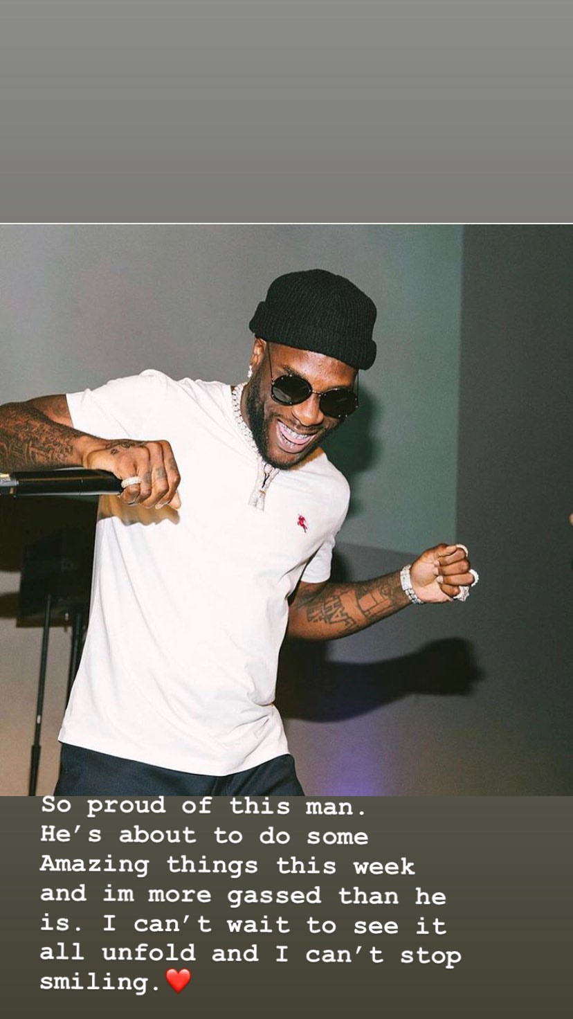 British rapper, Stephanie Victoria Allen, officially known and addressed as, Stefflon Don gushes over her boyfriend, Nigerian Afrobeat singer, Burna Boy as she says she is so proud of him as he plans on doing some amazing things this week.
