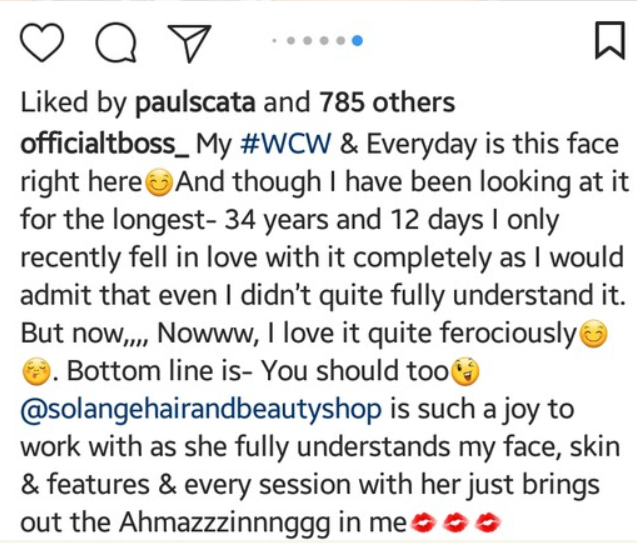 “My #WCW & Everyday is this face right here�And though I have been looking at it for the longest- 34 years and 12 days I only recently fell in love with it completely as I would admit that even I didn’t quite fully understand it. But now,,,, Nowww, I love it quite ferociously��. Bottom line is- You should too� @solangehairandbeautyshop is such a joy to work with as she fully understands my face, skin & features & every session with her just brings out the Ahmazzzinnnggg in me���