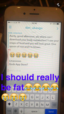 Tania Omotayo shared this funny message she got by via chat from a fan on Snapchat. Tania offers a considerable measure of snaps of various dishes she eats and still looks great. This incited the young lady to ask where she can “download” Tania’s body digestion system… Lol