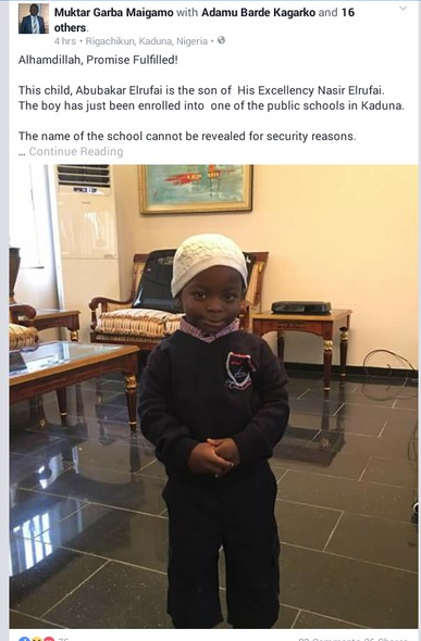This child, Abubakar Elrufai is the son of His Excellency Nasir Elrufai.