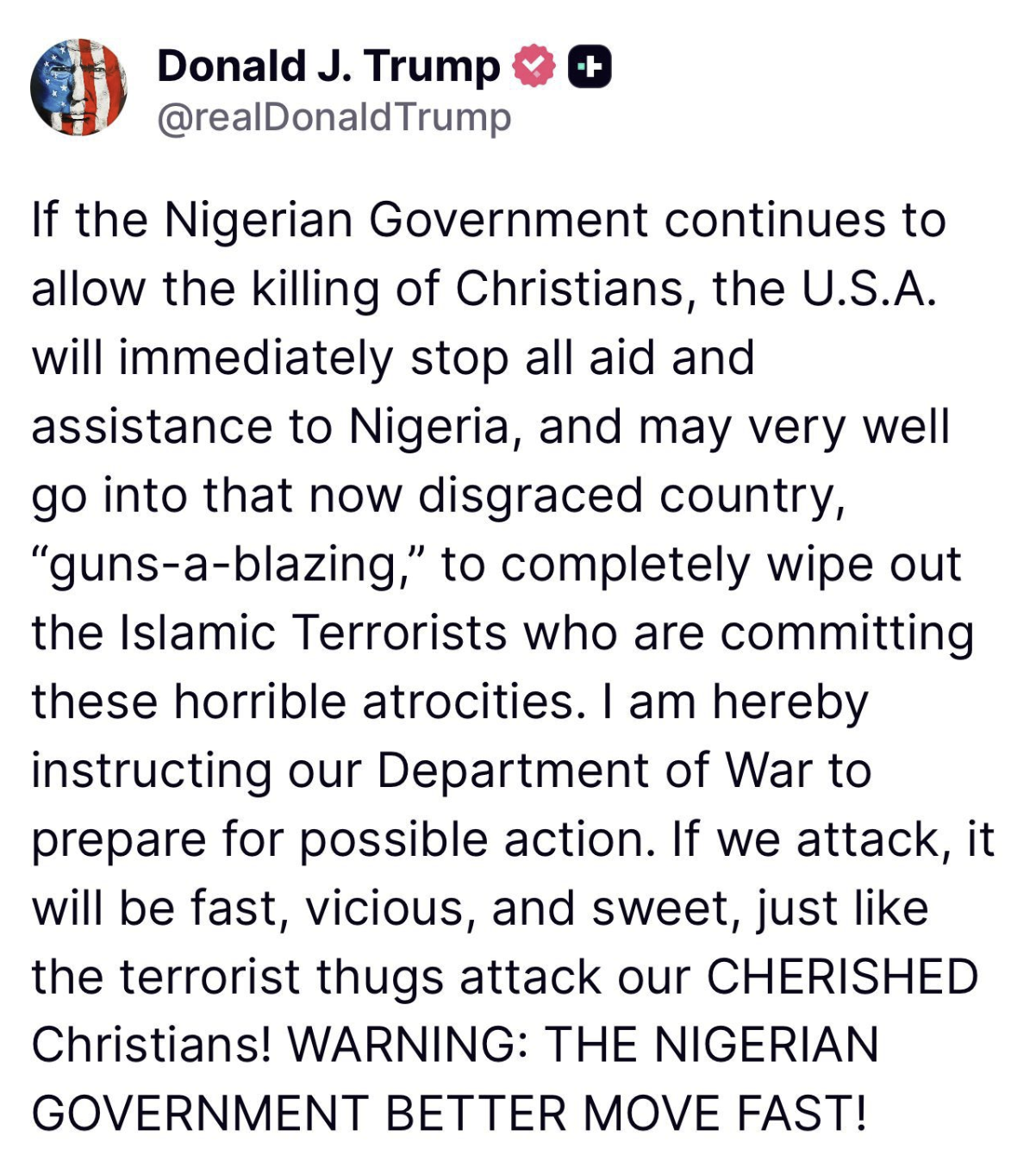The U.S.A and its gimmicks. They always lose in the end. They are done with “drug warlords” narrative. Now they need a new one to draw attention from a real-life GAZA genocide supported and abetted by the de facto leader of the Anglozionist empire, the U.S.A They have failed already. U.S.A. and Saudi Arabia, with their terrorist horde, have been the ones sponsoring everything in Nigeria again, together with their permanent puppets. The terrorists are just foot soldiers of both the ...