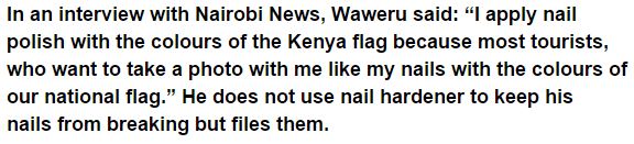 Joseph Waweru and his 1.3 foot since quite a while ago, lacquered nails are celebrated in Mombasa. He is a tourist attraction of sorts, earning anything from KES 2500 ($28) to KES 5000 ($56) every day.