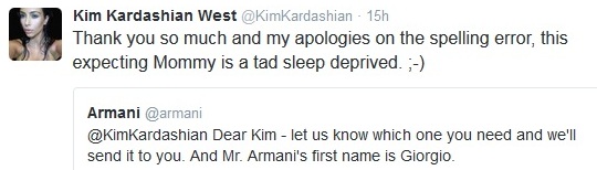 Kim K pleasantly replied to Armani’s twitter handle who corrected her on Monday over her incorrect spelling of his name.