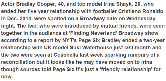 Home / Naija Gist / Foreign / So Bradley Cooper & Christiano Ronaldo’s ex Irina Shayk are now dating ?