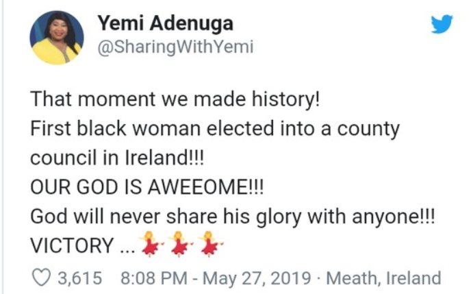 After securing her seat on Meath County Council, she is the first black woman to be elected onto Meath County Council.
