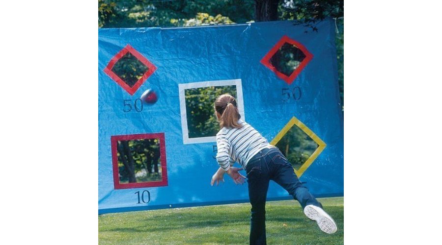 Create your own target game by stringing up a tarp between two trees, cutting some shapes into the tarp, with some being bigger than others, outlining them with tape and giving the holes a score. Then get a small ball and let your children try and score as much as they can in 5 throws!