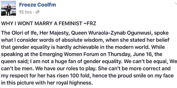 While defending her, OAP Freeze, went further to say: “Although feminism in itself is a noble cause, and by definition is a range of political and social movements and ideologies, that share a common goal: to define, establish, and achieve equal political, economic, personal, and social rights for women, the way many of my Nigerian sisters are going about it is becoming counter productive.