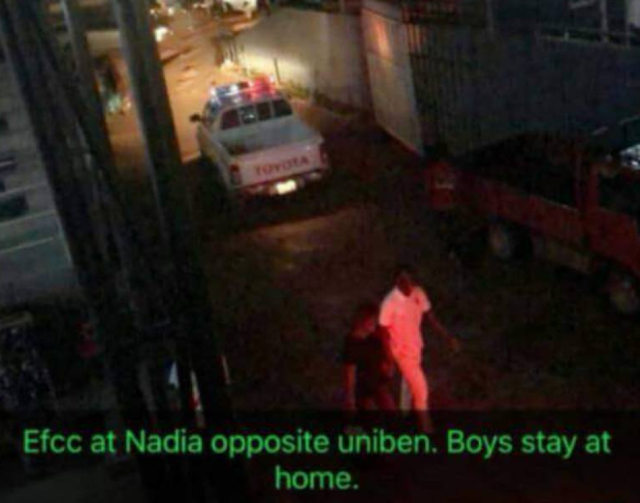 EFCC raids yahoo boys hide out in uniben, though our source is yet to offer us feed back as to learn the specific intent behind this sudden raid, undisclosed source explained that before they arrive the area, the purported fellows involved with cyber crime had gotten information from an EFCC member and many of them fled.. See the chat below.