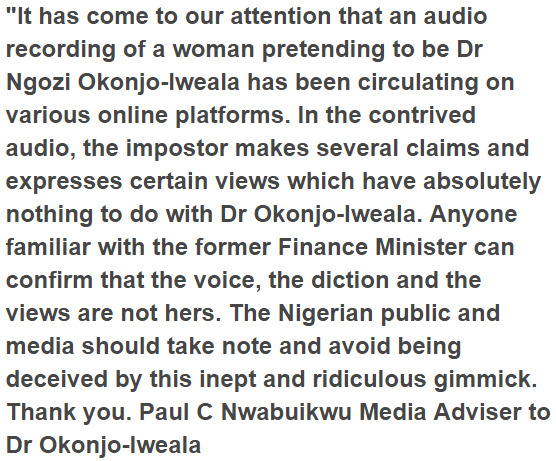 Few days back, previous Minister of Finance Dr. Ngozi Okonjo-Iweala alarmed people in general over a doctored sound recording of a lady professing to be her which has been circulating on the web. The previous minister portrayed the false sound as an endeavor to “deceive, lock horns as well sully her name” that has been flowing on the web. The following is an announcement discharged today by her Media Adviser: