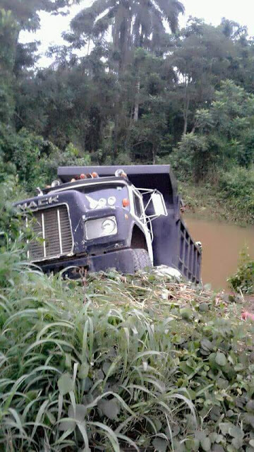 This is unusual. Some men celebrated their survival in a uncommon manner after being involved in a truck accident in Imo state. It was scooped that the durable truck from Okigwe failed brake during motion and landed in Efe River near Enerco Construction company in Okigwe part of Imo state.