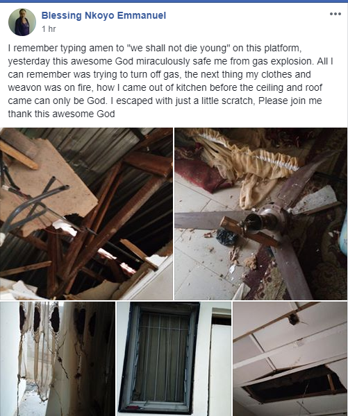 A lady is lucky to be alive after a gas explosion which occurred at her residence yesterday. Based on Blessing Nkoyo Emmanuel from Eket, Akwa Ibom but resides in Kano state, she was going to turn off the gas in her home before it exploded and set her home on fire.