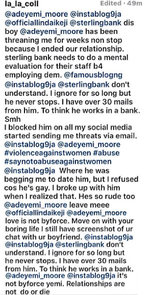 Girl tells Sterling bank staff who has allegedly been threatening her ever since she left him.