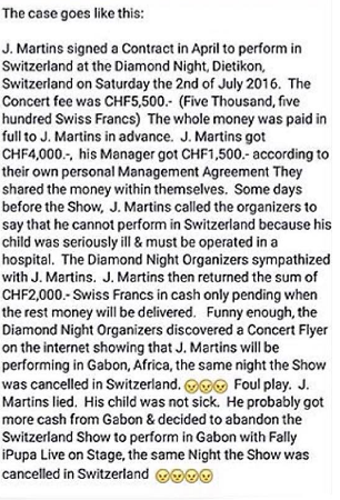 Man calls out singer J. Martins for allegedly collecting money for a show without showing up.