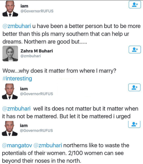 Home / Naija Gist / Metro life / Please Marry Southerner Than Can Help Your Dream – Man Tells Zahra Buhari