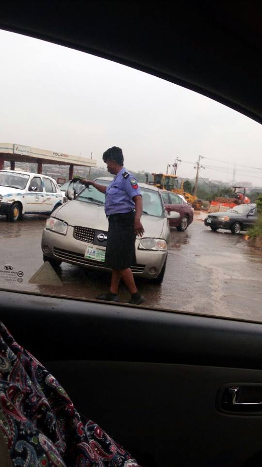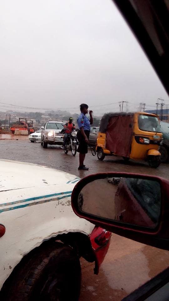 Today I saw a police woman in the rain, drenched and still doing her duty. Actively doing her job, despite the rain. Not running for shelter even though no one would blame her if she did. This is the kind of person that lifts the image of the Nigerian Police Force. Her name is Maryam, I didn’t get her last name properly or her rank. Her devotion to duty made the difference in a place synonymous with traffic gridlock on a day that isn’t comfortable.
