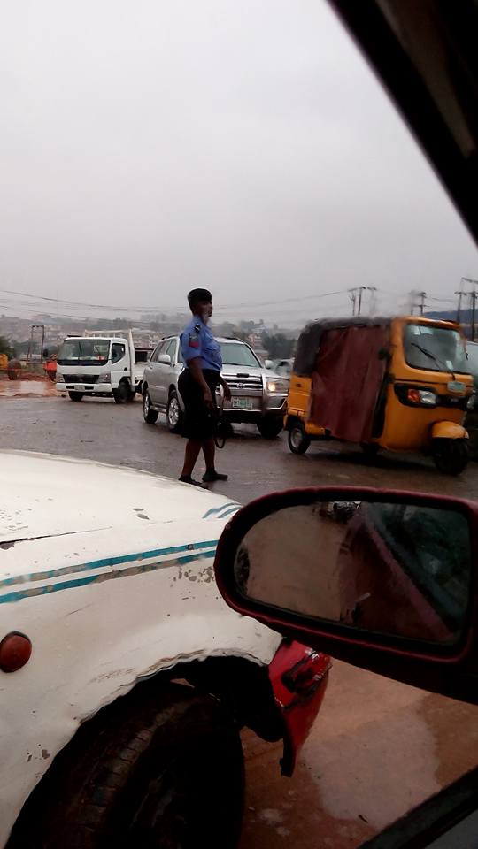 Today I saw a police woman in the rain, drenched and still doing her duty. Actively doing her job, despite the rain. Not running for shelter even though no one would blame her if she did. This is the kind of person that lifts the image of the Nigerian Police Force. Her name is Maryam, I didn’t get her last name properly or her rank. Her devotion to duty made the difference in a place synonymous with traffic gridlock on a day that isn’t comfortable.
