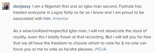 At the point when a fan called Don Jazzy out for not censuring Oba of Lagos in light of his assumed cooperation with Governor Fashola, the nonconformist music maker took to instagram to judiciously answer and clarify himself.