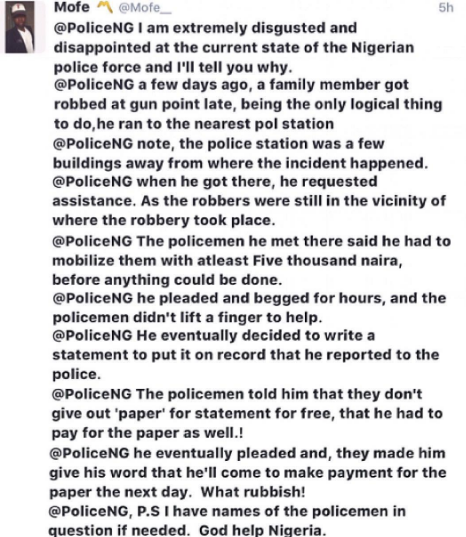 “You have to mobilize us with N5k and pay for the paper used in writing statement,” Nigeria Police to robbery victim