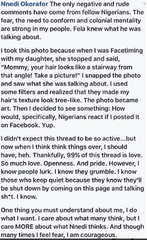 Nigerian-American writer, Nnedi Okorafor, reacts to the negative comments made by Nigerians after sharing a picture of her knee-length dreadlocks.