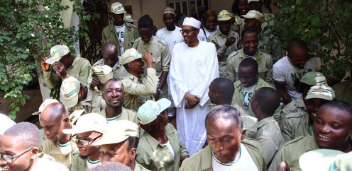 Some NYSC members serving in Daura, Kastina State, pay Pres. Buhari a courtesy visit at his country home.