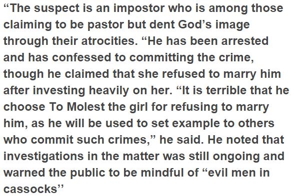 A 29-year old pastor cin harge of Christ Command Mission, Onicha-Igboeze, Onicha LGA of Ebonyi has been captured for raping Nnenaya Okute, an individual from his gathering after she dismisses his marriage proposition. As indicated by the police PRO, George Okafor, David carried out the wrongdoing on Feb. 27. The suspect allegedly baited the casualty to an uncompleted building at Umuobunna Uburu and assaulted her.