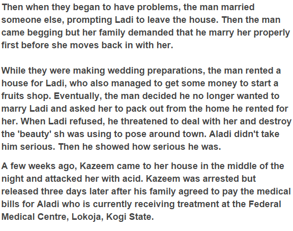 25 year old Aladi Sule was assaulted with acid by her ex-partner, Kazeem Abdullahi, a couple of weeks acid in Kogi state.