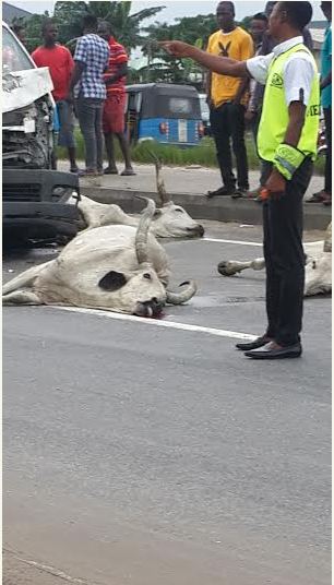 This took place today along Ughelli Express way in Delta state. A bus hit and killed some cows on a highway.