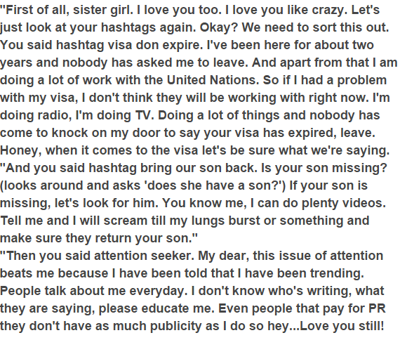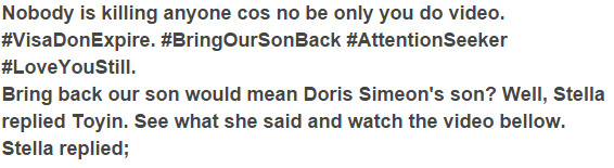 In a video journal she dropped yesterday titled ‘Mean Tweets and Hate Mails’, performing artist Stella Damasus answered mean tweets coordinated at her from fans and ‘haters’. She read out the mean tweets & reacted to each one of them, most times with a giggle. The last one she read out was one from performing artist Toyin Aimakhu who composed “Madam, Nigeria is my nation.