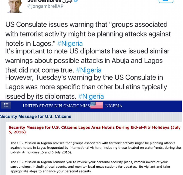 The statement is on their website and it reads: “The U.S. Mission in Nigeria advises that groups associated with terrorist activity might be planning attacks against hotels in Lagos frequented by international visitors, including those located on waterfronts, during the Eid-al-Fitr holidays (5 and 6 July 2016).