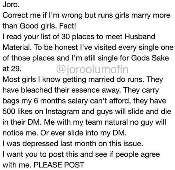 Lady cries out to @joroolumofin about “runs girls” finding more husbands than good girls