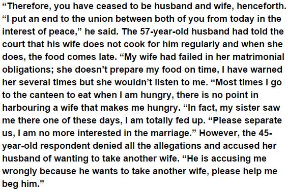 An Ikorodu Customary Court, Lagos, on Tuesday broke down a 25-year-old marriage, between one Olufade Adekoya and his wife, Olusola, over delay in preparing meals. Head of the court, Mr Olu Adebiyi, who dissolved the marriage, said there was “no longer any love in the marriage.” Adebiyi said that the court had attempted a few times to accommodate their in-differences yet all endeavors demonstrated fruitless.