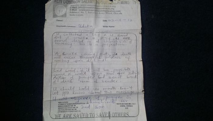 Pastor Chuks Mbamalu from Nnewi who is the GO of New Dominion Salvation Outreach Ministry In Salvation Army Str Okafa Isolo who pic is appended gave fake predictions to my wife who is currently ex and is presently being seen with the alleged Pastor in fast food joints and so on. One was that she ought to go to the congregation and rest for three days or she and my last child will bite the dust. I rejected my child from going. The other was I want to use her for ritual that I have belong to a secrete society, they likewise said that I will crumple and bite the dust and so on.