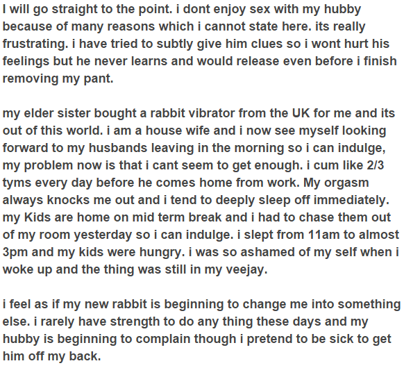 Home / Naija Gist / Relationships & Romance / Pls help: I dont enjoy s3x with my hubby but now I cum 2-3 times per day using S3x Toy.