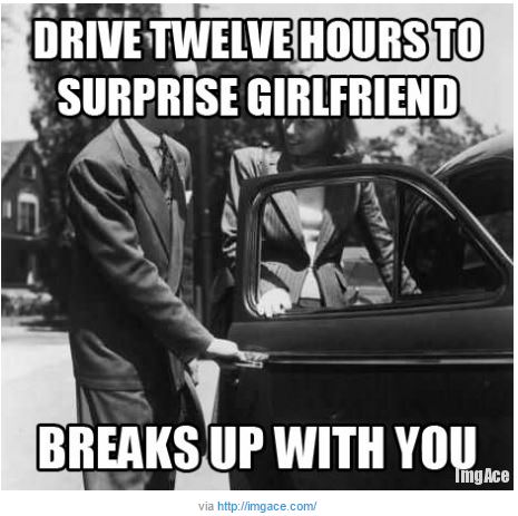 Sometimes you have to drive a long way to get dumped. At least she did it in person though, right. Screw that, you would rather save the gas, wouldn’t you?