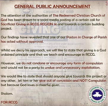 The RCCG authorities have addressed the issue of the controversial sacrifice form issued by one of their pastors. See the public announcement released bellow.