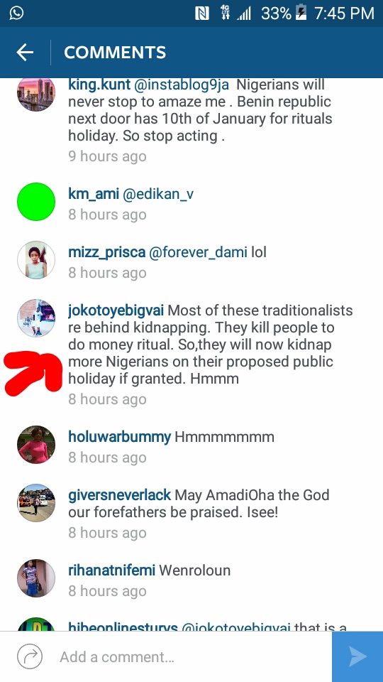 “ Most of these traditionalists are behind kidnapping. They kill people to do money ritual. So they will now kidnap more Nigerians on their proposed public holiday if granted.hmm”