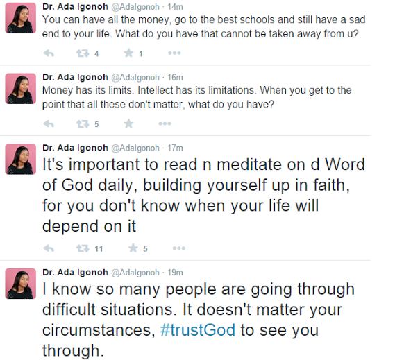 Dr Ada Igonor, one of the doctors at First Consultant Hospital who contracted the killer Ebola virus after Patrick Sawyer was conceded there took to Twitter tonight to share how she survived the destructive infection and how Eledumare spared her. See more of her tweets bellow…