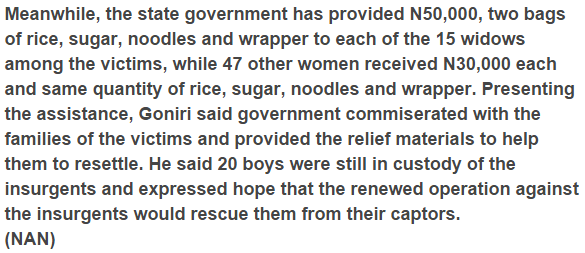 The victimized people were released by the faction members following three weeks of bondage. Alhaji Ahmed Goniri, the state Commissioner for Justice and Chairman of the State Committee on Rehabilitation of Victims of Insurgency, said this while tending to newsmen in Damaturu on Thursday.