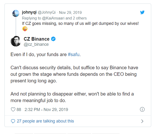 CZ’s response got the replies of two other crypto enthusiasts. The first user charged CZ not go missing just like the trending IDAX Global CEO, while one other supposed Binance user said, “If CZ goes missing, so of us are certain to get dumped by our wives!”Howbeit, CZ of Binance didn’t ignore their direct charges. He assured that their funds are safe with the Binance exchange even when he suddenly goes missing. But I believe the most effective is to not go missing, as he later reiterated in his tweet to calm them down.