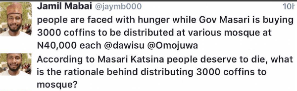 Yesterday, the Katsina State Police Commissioner, Usman Abdulahi, said a blogger, Jamil Mabai, have been detained for posting that the Katsina State government bought 3,000 coffins and distributed them to mosques because the federal government wanted people to die.